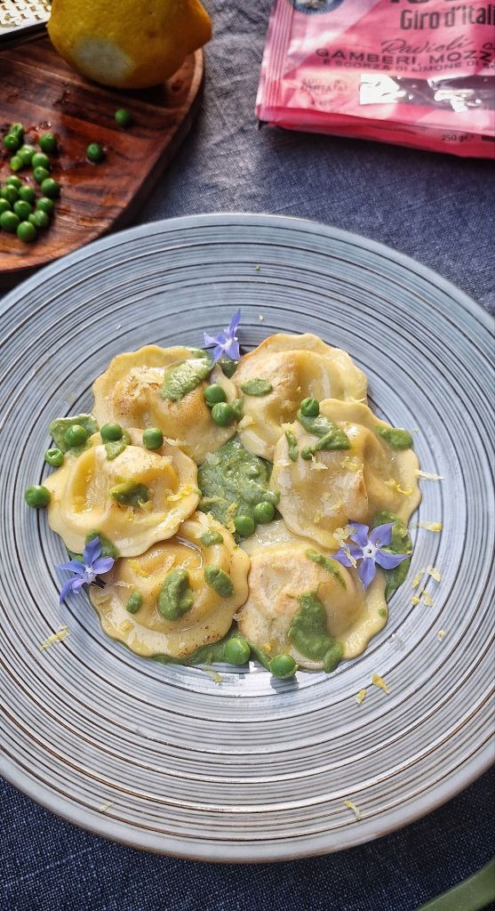 Stanchi dei soliti condimenti per i ravioli confezionati? Tanti tipi e forme diverse, tante idee, tanti gusti, ma che stanchezza prepararli sempre nello stesso modo: in bianco, burro e salvia, alla panna…. pratici, veloci, questo è vero, ma cambiare condimento li rende diversi, gustosi, completi. Qui davanti a questo ripieno ” gamberi mozzarella e limone” mi lascio cadere sulla sedia, braccia a penzoloni. Le mie idee sono come nebbia fitta, una X su burro e salvia, tanto meno la panna, da scartare subito. In bianco così non mi vanno, aggiungo pezzetti di gambero? Ma se è già dentro cosa faccio lo metto pure fuori? Formaggio c’è…cosa manca? La verdura!!! Andiamo, venite con me, ho un’idea!