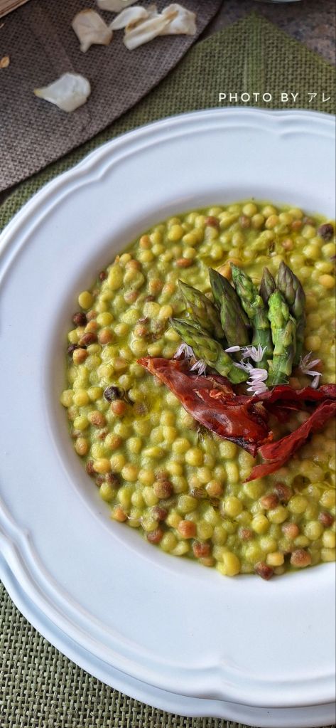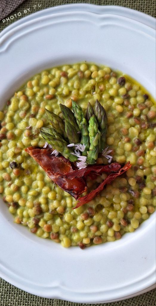 Su una griglietta o in un padellino antiaderente appoggiare le fette di speck e renderle croccanti senza bruciarle. Quando la fregula è cotta, l’ultimo mestolo sarà di salsa di asparagi. Mantecare con del burro se piace, poi impiattare con le punte tenute da parte e pezzetti di speck