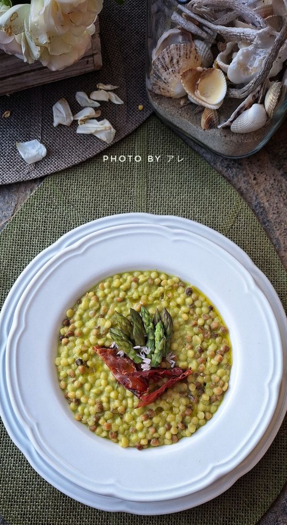 Iniziare dividendo gli asparagi tagliando le sole punte poi i gambi in due parti, la parte piu bassa bianca e quella verde piu alta. Mettere a bollire dell’acqua leggermente salata con i gambi per 10 minuti. All’ultimo minuto aggiungere le punte poi scolare tutto tenendo l’acqua. Far raffreddare le punte mentre i gambi piu bianchi potete rimetterli nell’acqua che terrete calda. Servirà come “brodo”. I gambi verdi invece in un mixer con un cucchiaio di olio, sale e pepe e frullare tantissimo, deve uscire una crema morbida e liscia. Tostare la fregula in due cucchiaini di olio extravergine, quando sarà brillante, aggiungere l’acqua con i gambi bianchi un mestolo alla volta come si fa col risotto.
