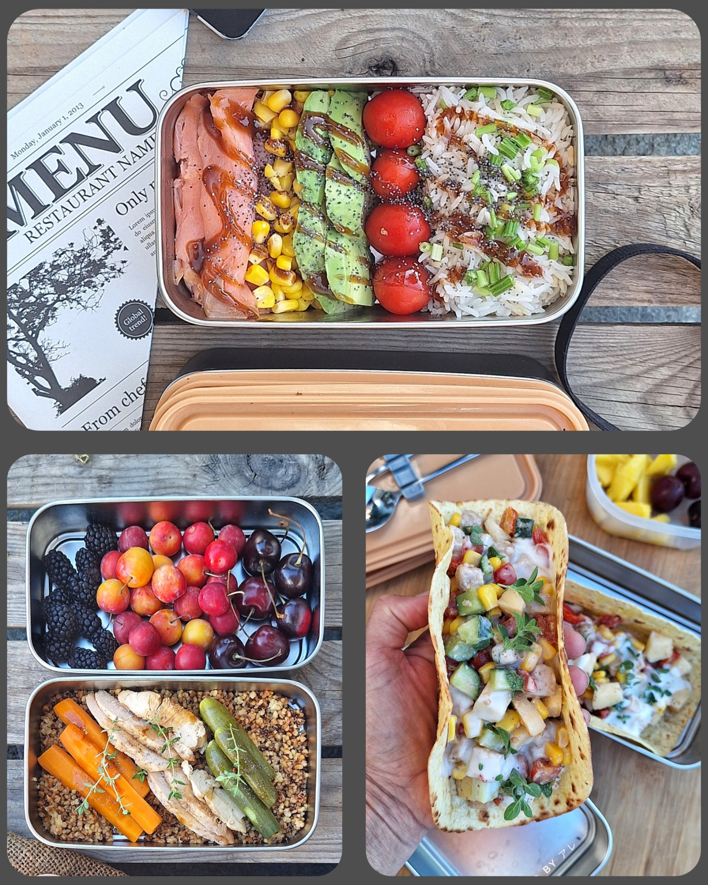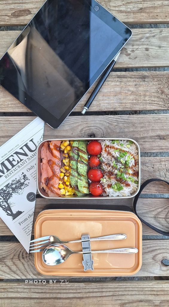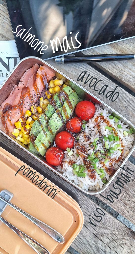 Classico e velocissimo: cuocere il riso basmati prima tostandolo in un cucchiaio di olio come si fa per i risotti, poi aggiungere acqua fino a coprirlo tutto, salare e portare a cottura. Il riso assorbirà l’acqua ma non si impasterà! Mettere nel contenitore il riso, gambi di prezzemolo tritati fine, pomodorini, avocado, mais, fette di salmone selvaggio, irrorare con salsa okonomiyaki e semi di chia.