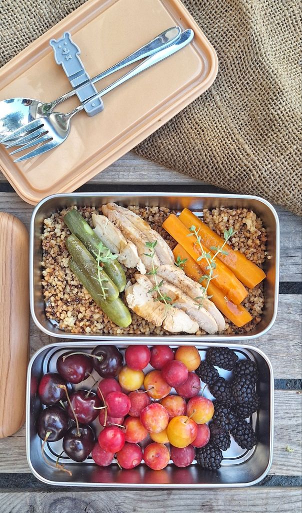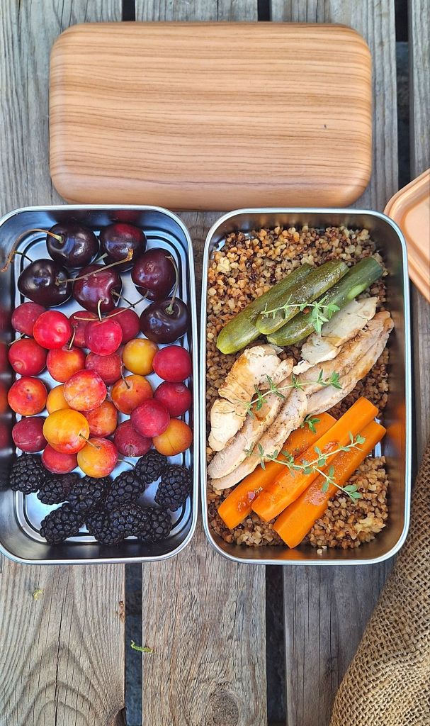 TAGLIATA DI POLLO CON QUINOA BIANCA E ROSSA SALTATA, ZUCCHINE E CAROTE AL VAPORE, FRUTTA MISTA