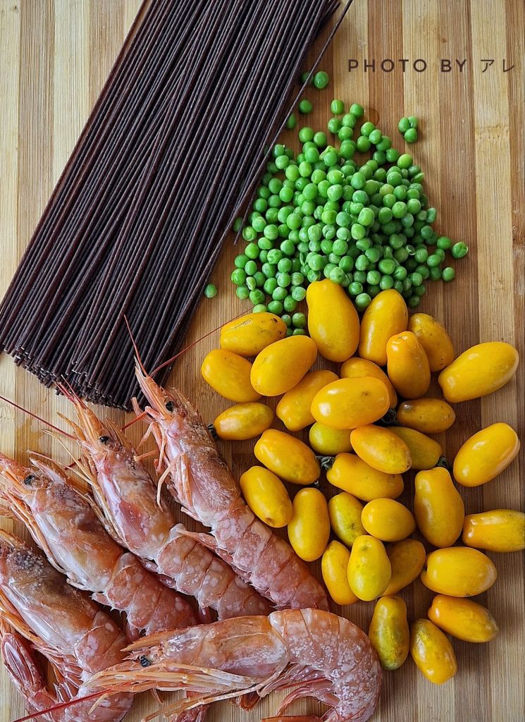 SPAGHETTI DI RISO NERO GAMBERI PISELLI E POMODORINI GIALLI