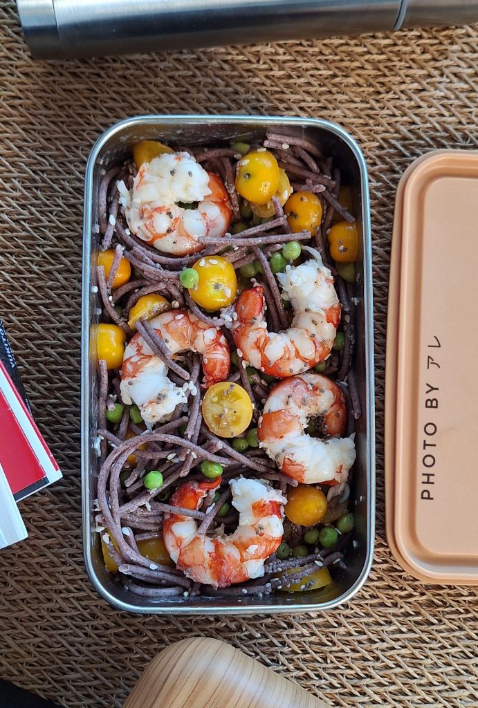 Lessare gli spaghetti, scottare i gamberi, tagliare i pomodorini e condire il tutto con una emulsione di olio aceto di riso e semi di sesamo.