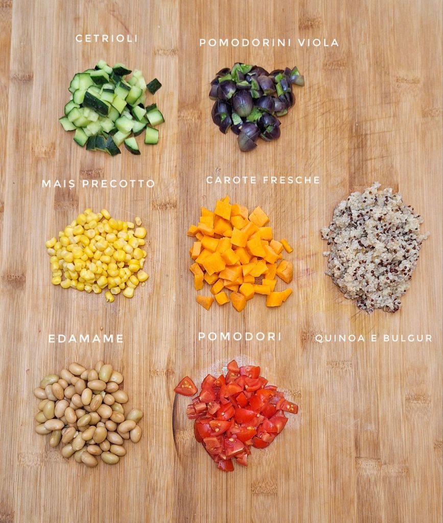 Tagliare a dadini tutti gli ingredienti sotto. Cuocere a vapore la quinoa e il bulgur insieme alle edamame. Mescolare tutto e condire con salsa di soia, mirin e saké