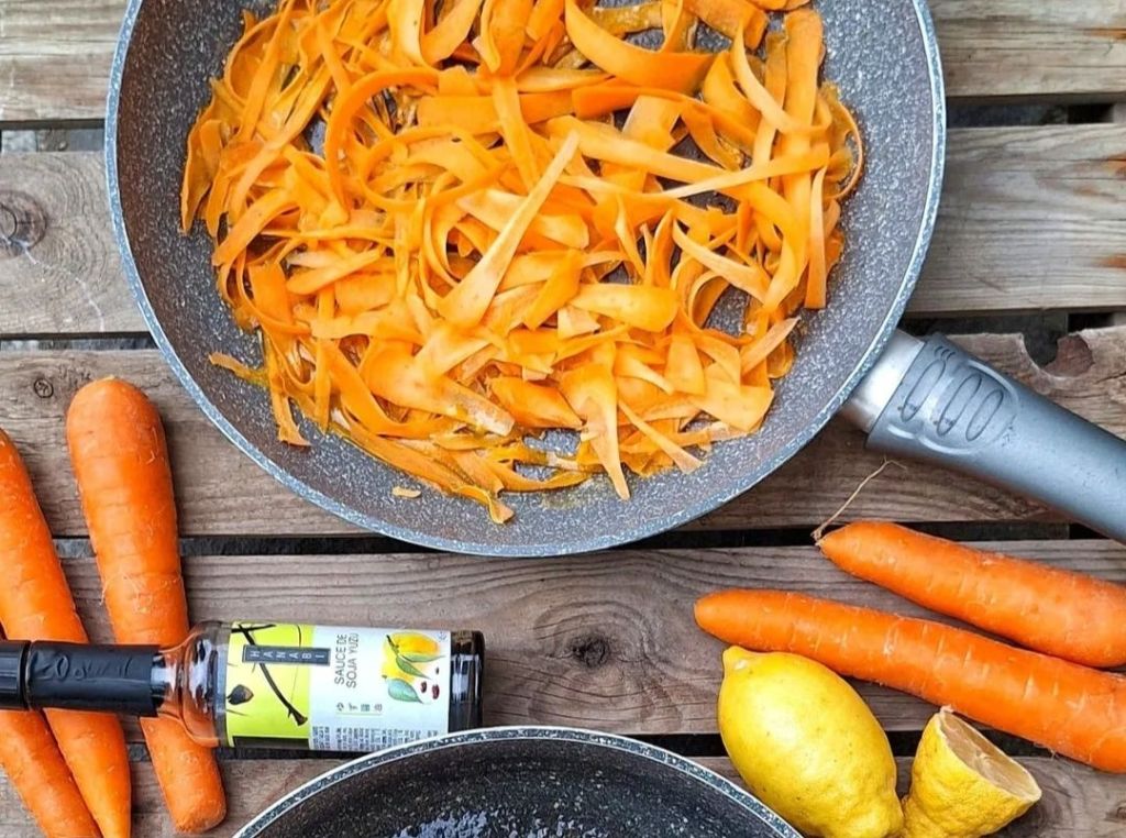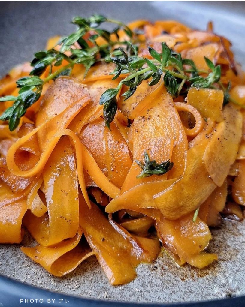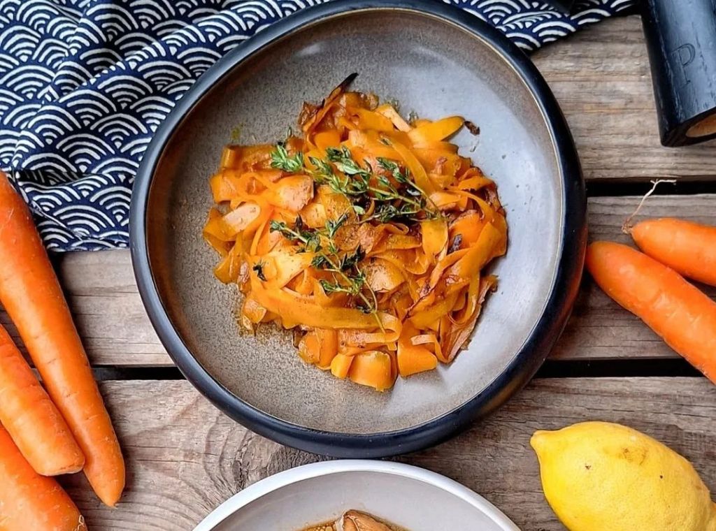 Tagliare le carote con la mandolina e creare dei nastri. In una padella mettere un tocchetto di burro, a fiamma alta rosolare bene devono appassire e colorare un pochino, poi aggiungere il succo di limone, un giro di salsa di soia, pepe e un cucchiaio di acqua calda, mettere il coperchio per 5/6 minuti. Poi fiamma nuovamente alta per 1 minuto senza coperchio. Spegnere e aggiungere timo fresco.