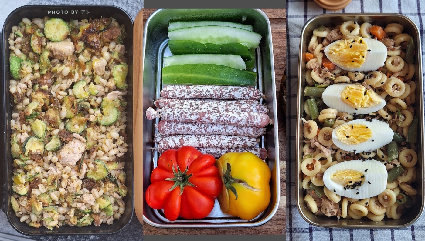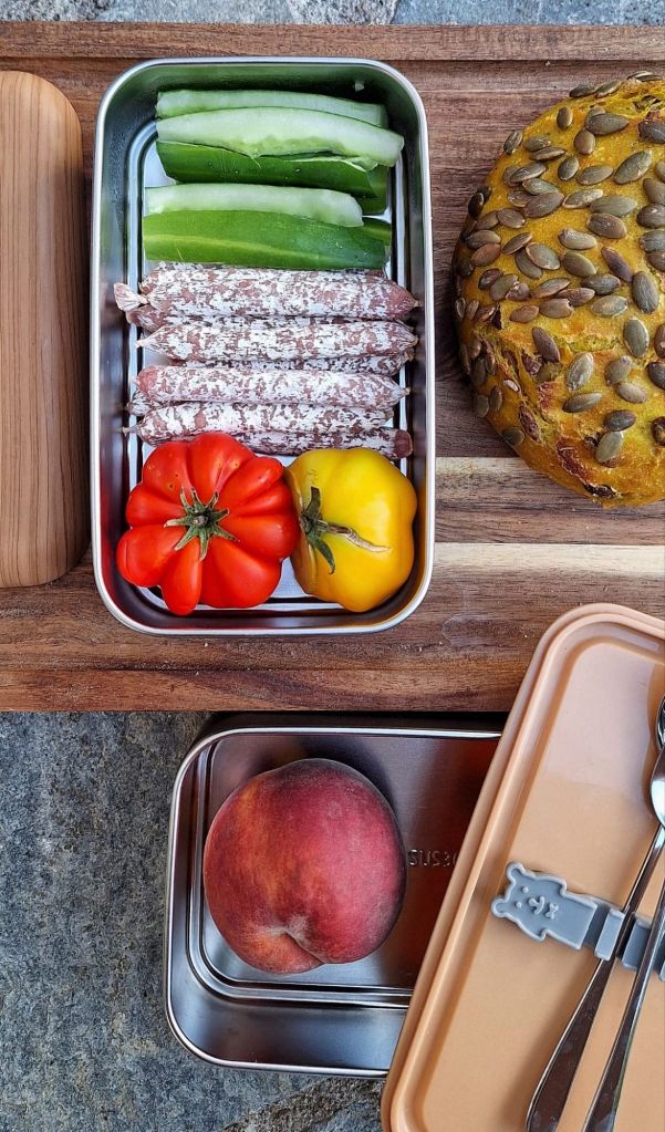 In realtà questa schiscetta non ha ricetta. I salamini cosi piccini li trovo in Francia, sono salami comuni ma dalla forma accattivante. Ho tagliato dei cetrioli del mio orto cosi come i pomodori. Ho aggiunto due fette di pane alla curcuma con semi di zucca