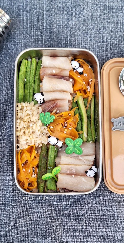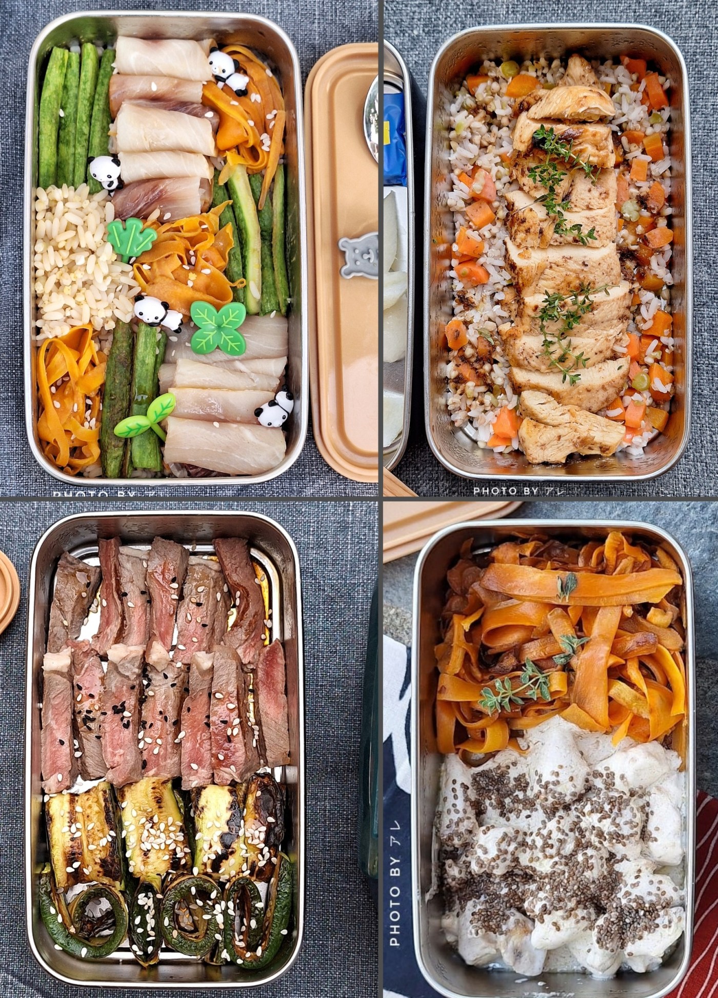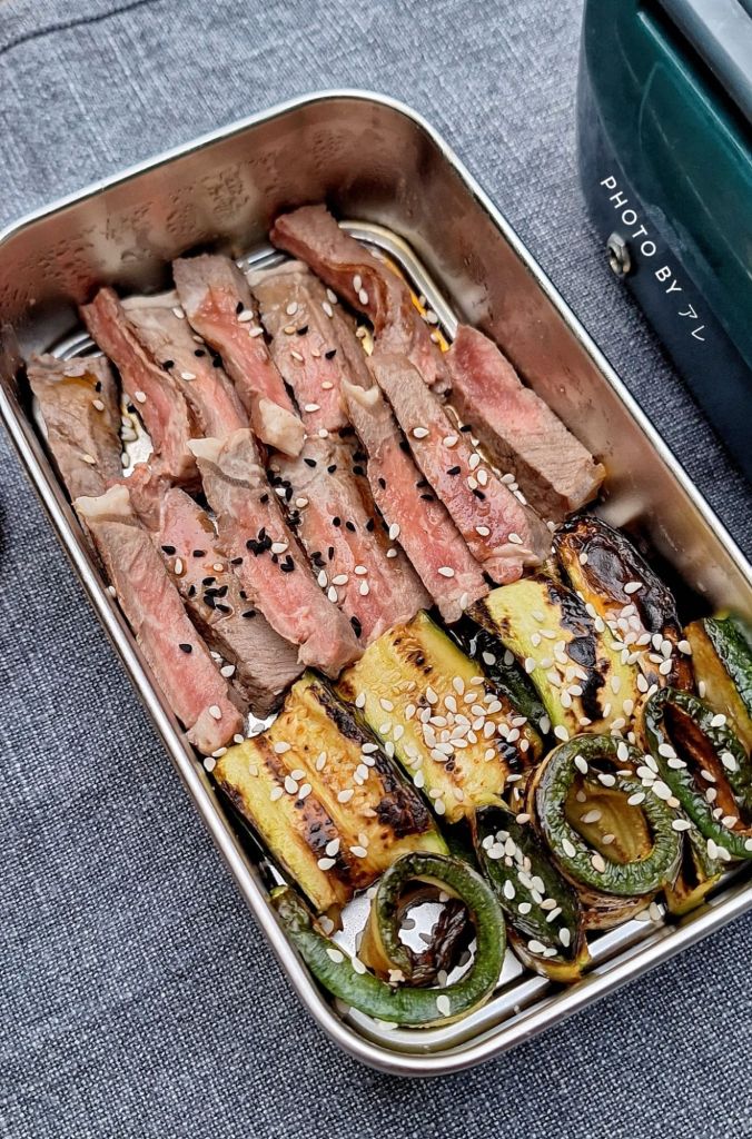 Grigliare sulla piastra o sul grill una fetta di ottimo roastbeef massaggiato prima a dovere con sale grosso e olio. Cuocere 2 minuti per lato in base all’altezza della fetta. Deve essere almeno 3 cm. Tagliare a fette una grossa zucchina e grigliarle. Preparare la schiscetta con la carne tagliata a fettine, le zucchine, semi di sesamo bianco e nero