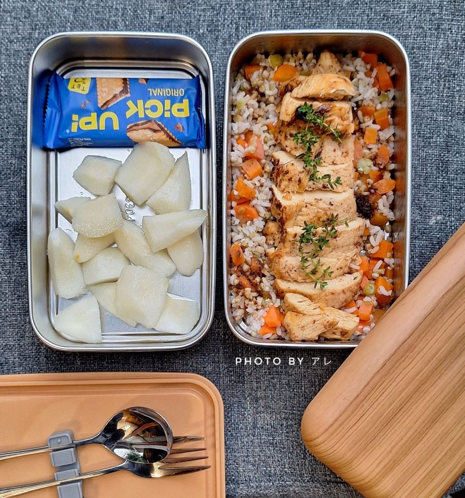 Tagliare una carota a cubettini piccolini, lessarli in acqua leggermente salata per 10 minuti. Scolarli e passarli in padella un olio o burro e rametti di timo fresco. Cuocere 80 gr di riso basmati prima tostandolo con un cucchiaino di olio poi coprendolo completamente con acqua. Condire il riso e le carote con pico aceto di mele, olio, sale e pepe a piacimento facendo poi raffreddare il tutto. Rosolare in poco burro un filetto di pollo o 1/4 di petto di pollo, per 5 minuti a fiamma alta girandolo spesso. Poi bagnare con un mestolo di brodo vegetale coprire con coperchio e cuocere 15 minuti a fiamma bassa. Togliere il coperchio, alzare la fiamma, rosolare il pollo da tutti i lati e quando ben colorito, farlo raffreddare su di un tagliere coperto da carta forno. Preparare la schiscetta tagliando il pollo a fette e appoggiare su riso e carote. Aggiungere timo fresco
