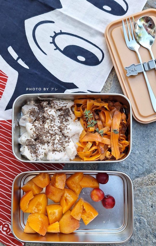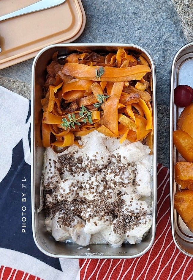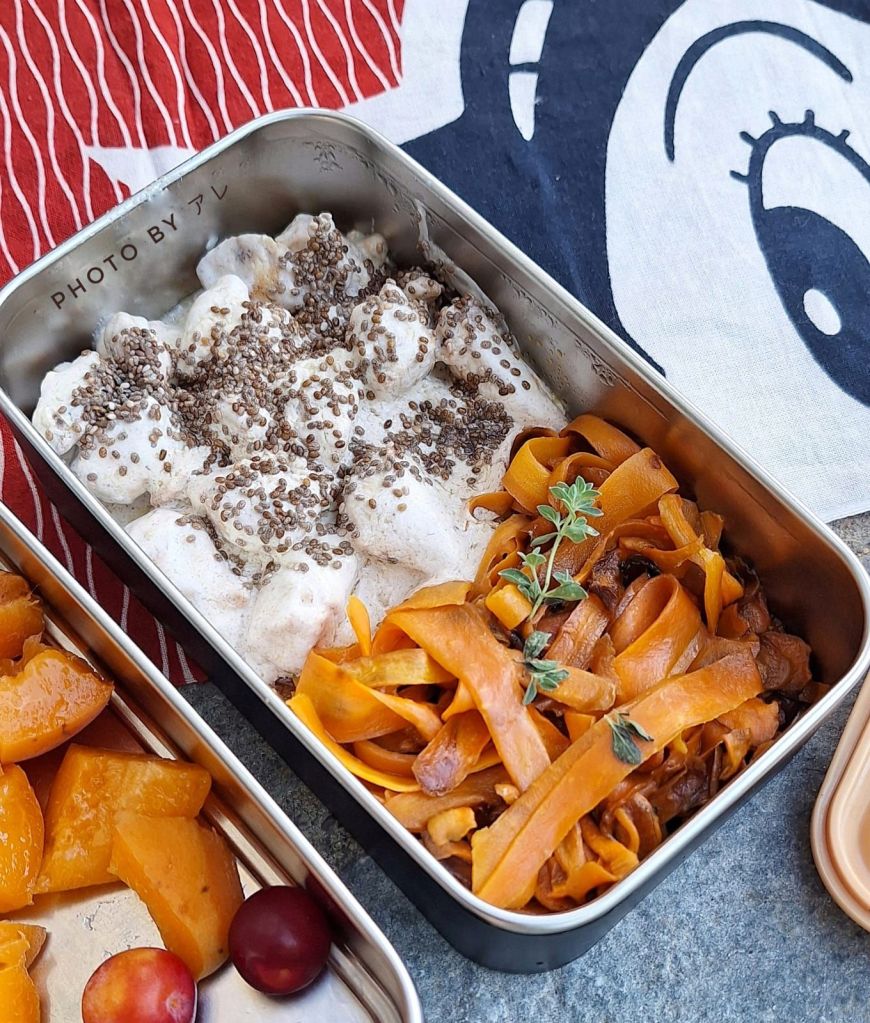 Tagliare un petto di pollo in cubetti abbastanza grossi. Rosolare i cubetti in poco burro o olio extravergine per qualche minuti affinché siano coloriti. Abbassare la fiamma, aggiungere due cucchiai di panna vegetale, un cucchiaio di latte di cocco in crema, un cucchiaio di acqua calda salata, coprire con il coperchio e cuocere 15 minuti. Preparare le carote a nastro (cercate sul blog il procedimento è facilissimo). Comporre la schiscetta con il pollo, spolverare di semi di chia, aggiungere le carote con timo fresco.