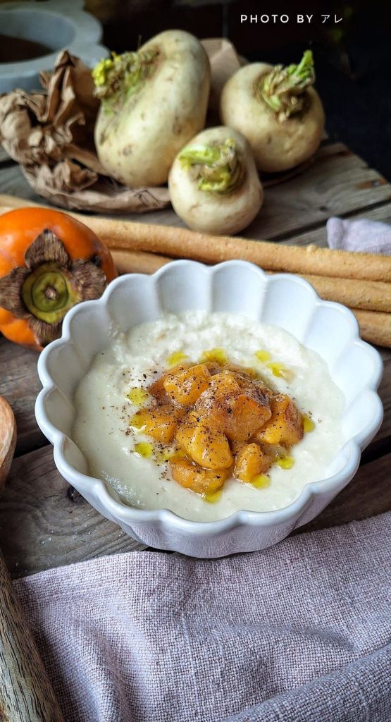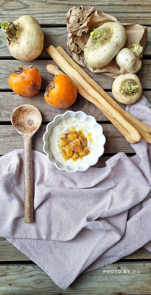 Da quando ho scoperto l’esistenza della rapa bianca, appena la trovo al mercato contadino mi ci fiondo e ne faccio razzia! È talmente versatile che non ne posso fare a meno. Stavolta però insieme ho trovato un dono, un collega gentile ha portato da provare i suoi cachi e anche io ho potuto godere di questo regalo! Tornata a casa ho posato in cantina le rape, ho riposto i cachi nella cassetta con il giornale e ho spostato le noci raccolte in Alsazia ancora acerbe notando che ora sembrano ormai pronte. Mentre percorro il corridoio inizio a pensare, le dita ticchettano, i pensieri si rincorrono. Qualcosa di veloce, di buono, di diverso! E ora partiamo, dai venite con me! Orologio alla mano mezz’ora si mangia!