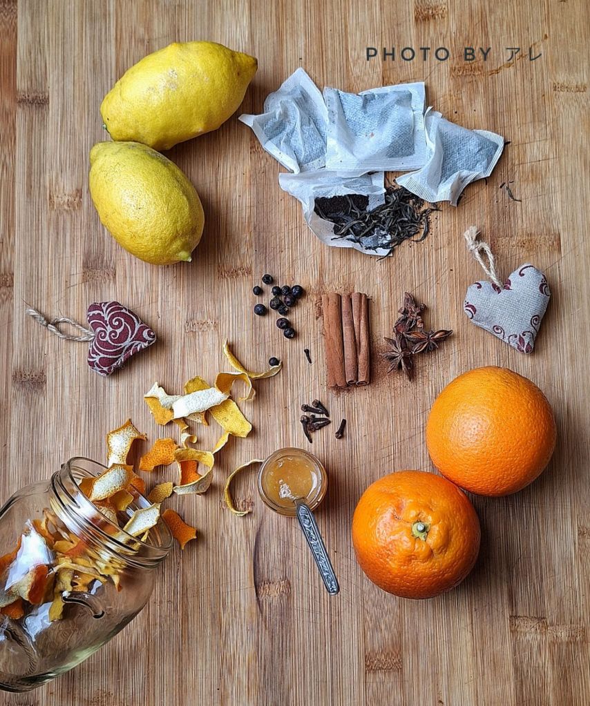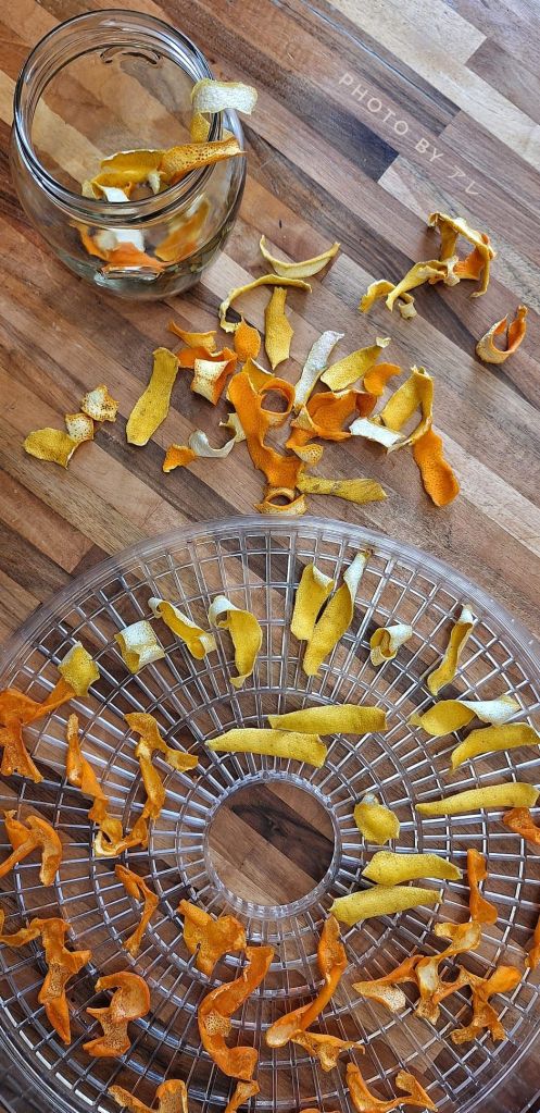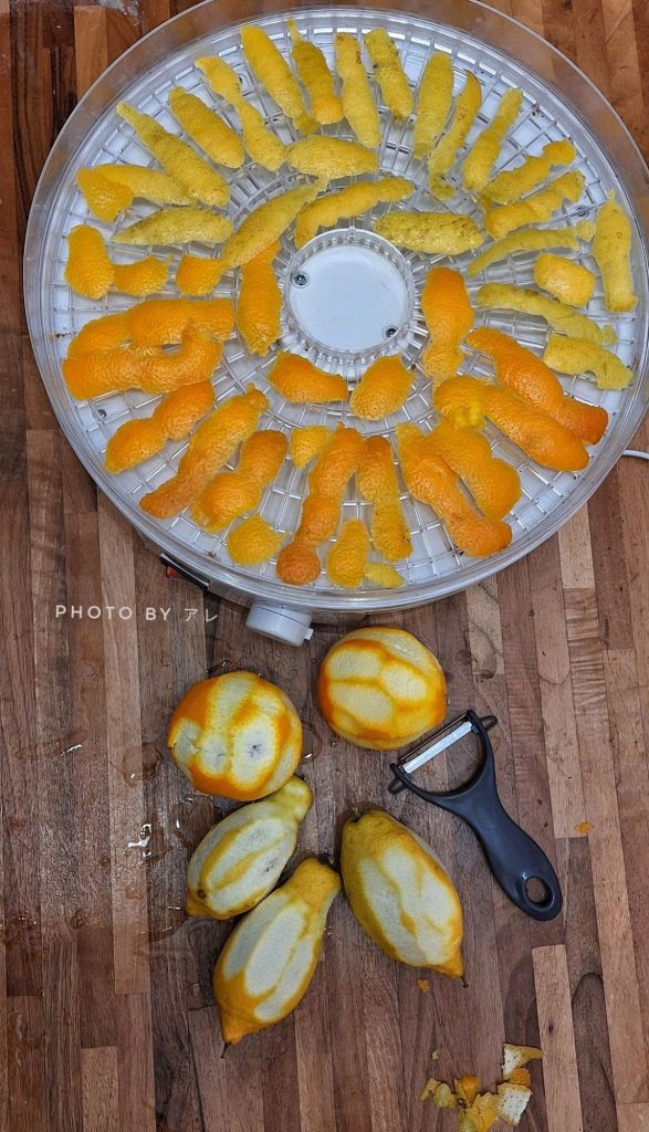Non avendo trovato le scorzette di limone e arancia ho optato per essiccarle io con essicatore. I limoni sono del mio giardino, se decidete anche voi per questa tecnica usate solo arance e limoni bio, lavate bene la buccia e ricavate delle striscioline con una mandolina cercando di non prelevare la parte bianca che darebbe troppo sapore amaro.