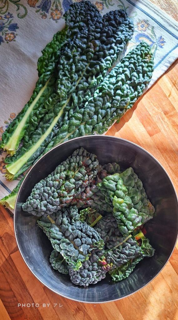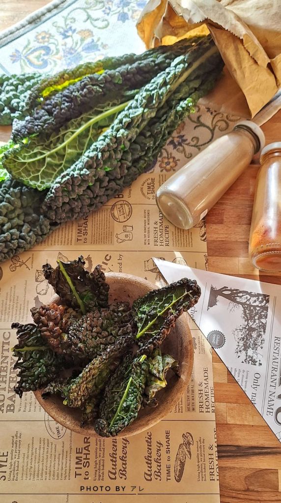 Scegliere le foglie più carnose. Tagliare la costa centrale solo verso il fondo. Poi tagliare anche con una forbice le foglie della dimensione che vi piace ma non troppo piccole. Lavarle, metterle in una ciotola con un filo di olio, sale e se volete spezie tipo paprika, pepe, curry. Con le mani massaggiare le foglie poi metterle in friggitrice ad aria per chi ce l’ha per massimo 3 minuti. Fare attenzione perché le foglie leggere “volano” e si attaccano alla resistenza. Io ho messo delle piccole sfere di gesso che si usano per le basi delle crostate.