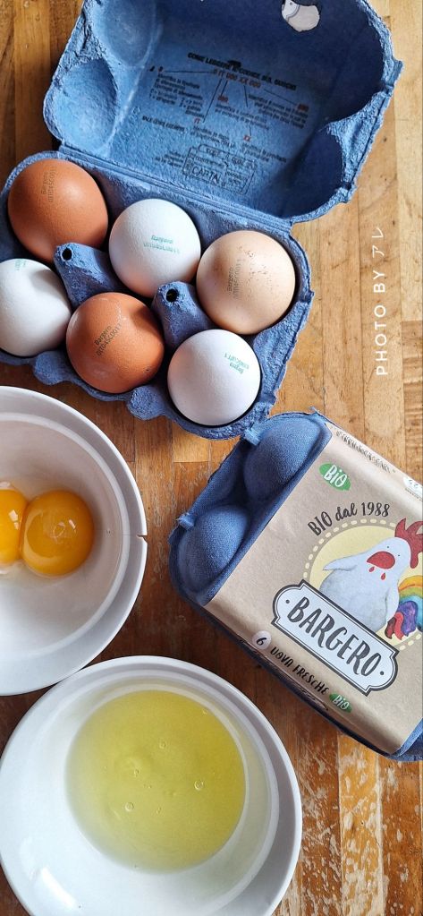 In due ciotoline separare gli albumi dai tuorli, montare a neve ferma gli albumi e solo verso la fine unire un cucchiaino di zucchero al velo.