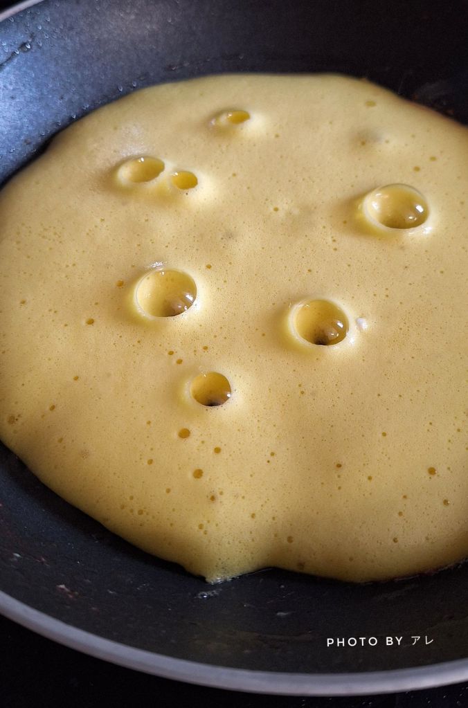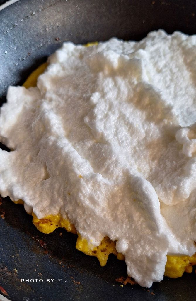 Unire gli albumi livellando la superficie, chiudere con coperchio e attendere 3 minuti al massimo a fuoco più basso per non far bruciare la frittata.