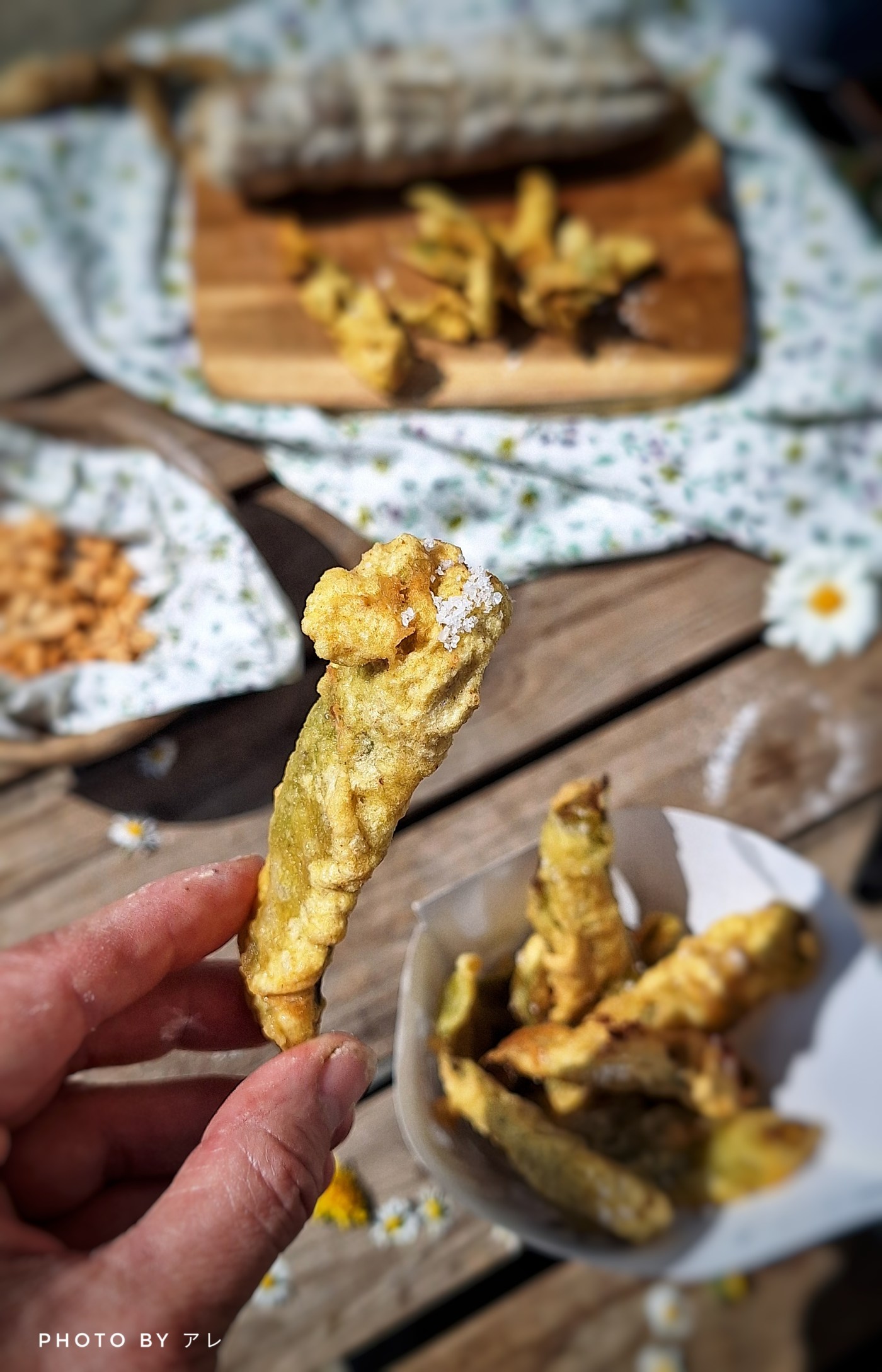 Sbattere le uova, aggiungere un pizzico di sale, di pepe e delle spezie da voi scelte. Aggiungere la farina 00 e l’acqua frizzante o la birra a filo continuando a sbattere con una frusta fino ad ottenere una pastella consistente liscia ma che non deve essere liquida. Passare le bucce nella pastella e friggerle in olio di semi di arachide o in alternativa passare i baccelli solo nell’uovo, poi nella farina di mais e infine nel pangrattato. Porle su una leccarda ricoperta da un foglio di carta da forno. Con uno spruzzino aggiungere un po’ di olio extravergine d’oliva su ogni baccello.