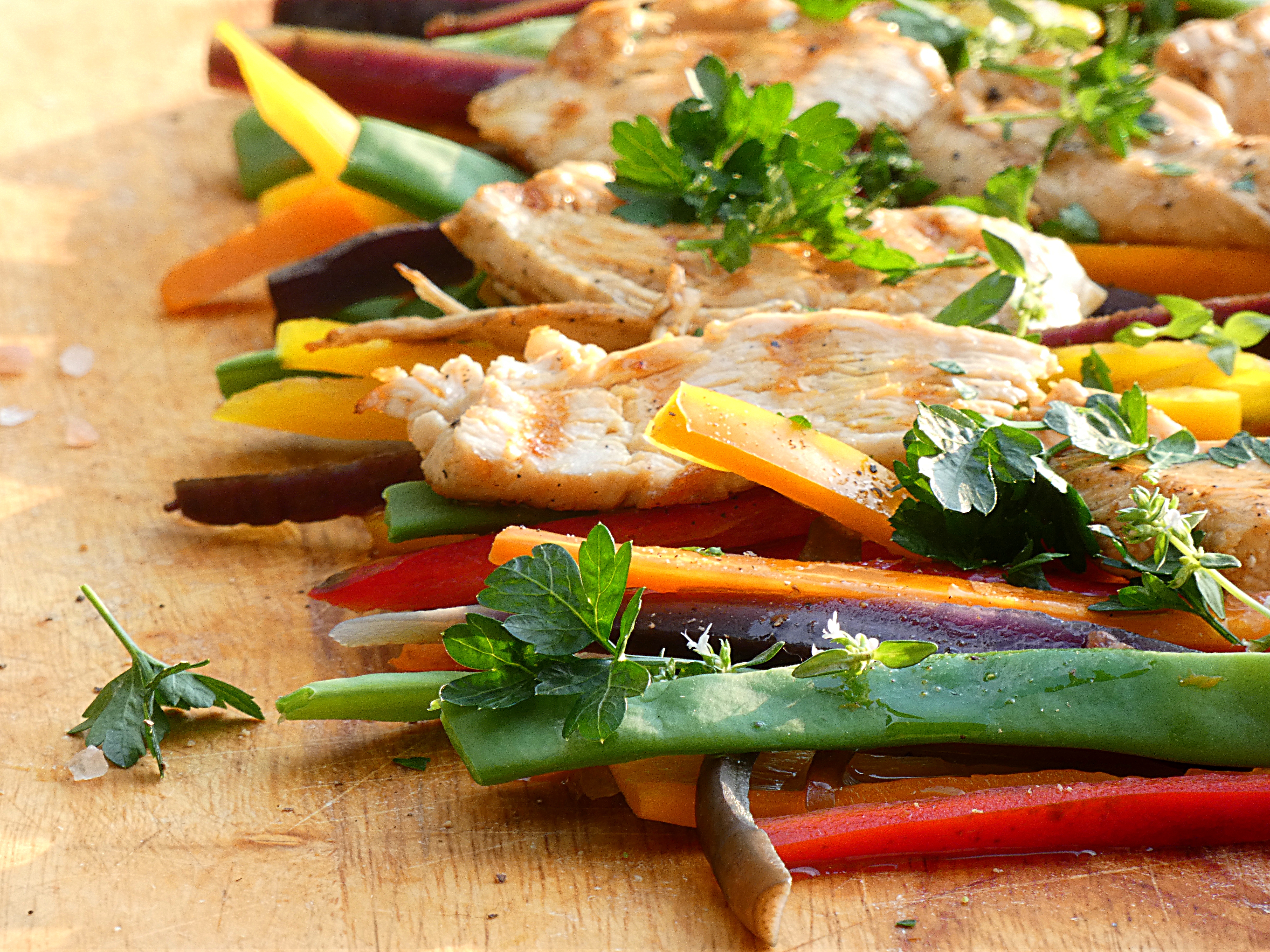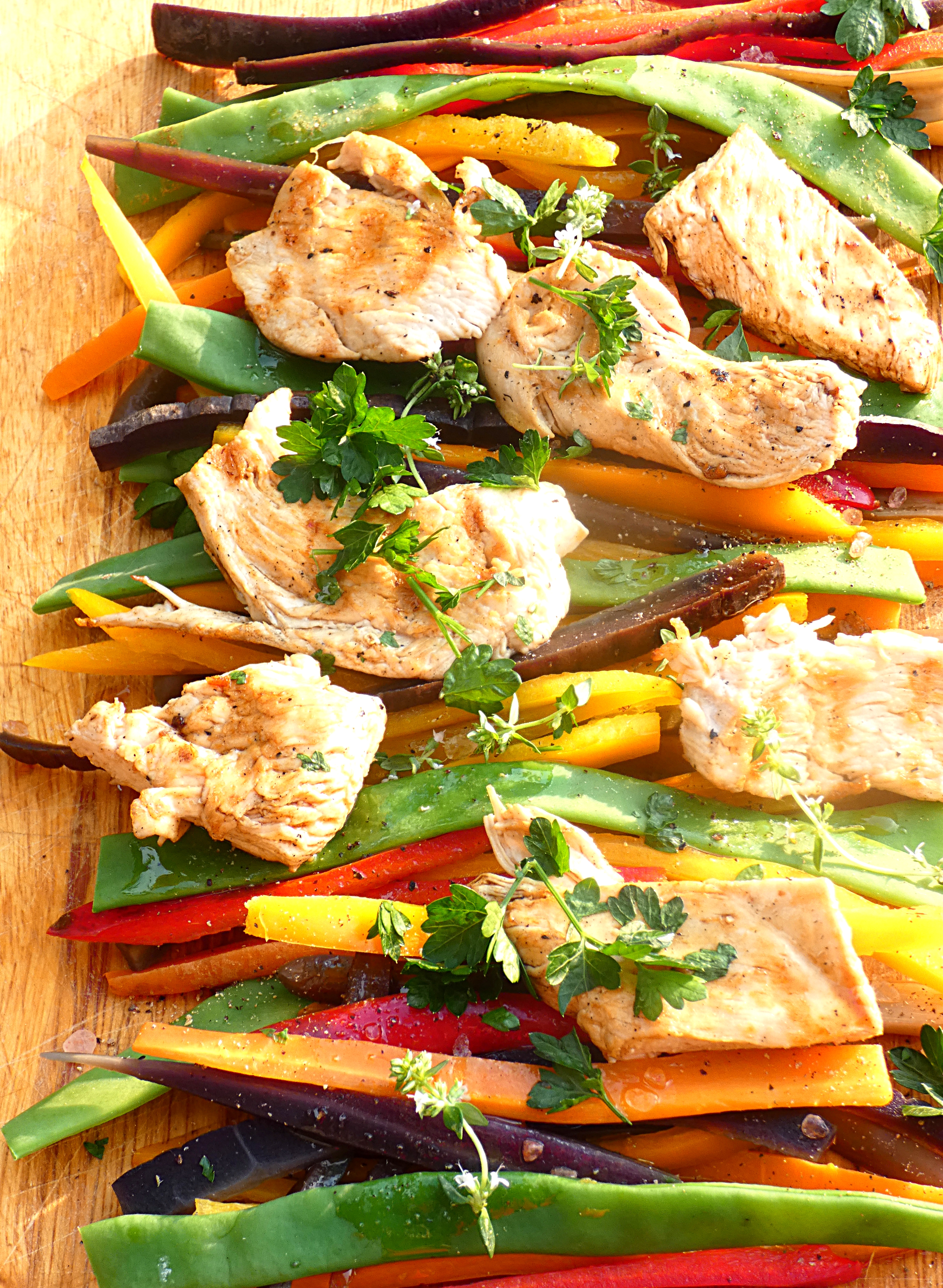 Una cena super veloce? Verdure che fanno bene e pollo alla griglia, tutto sul tagliere! Informale, simpatico, colorato! Buon appetito!
