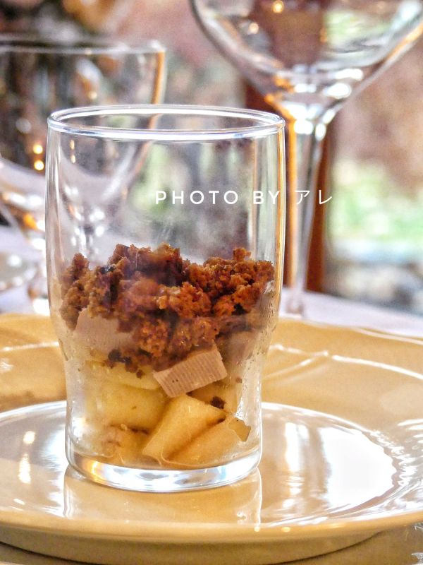 Foie gras d’oca, mele, crumble, una speciale amuse bouche.