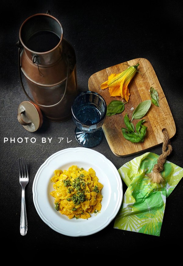 Farfalle, crema di fiori di zucca e grana al basilico, quando stiro le camicie?