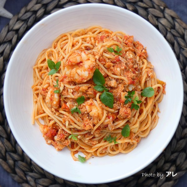 Spaghetti al sugo rosso di pesce e non si spreca nemmeno una pinna.